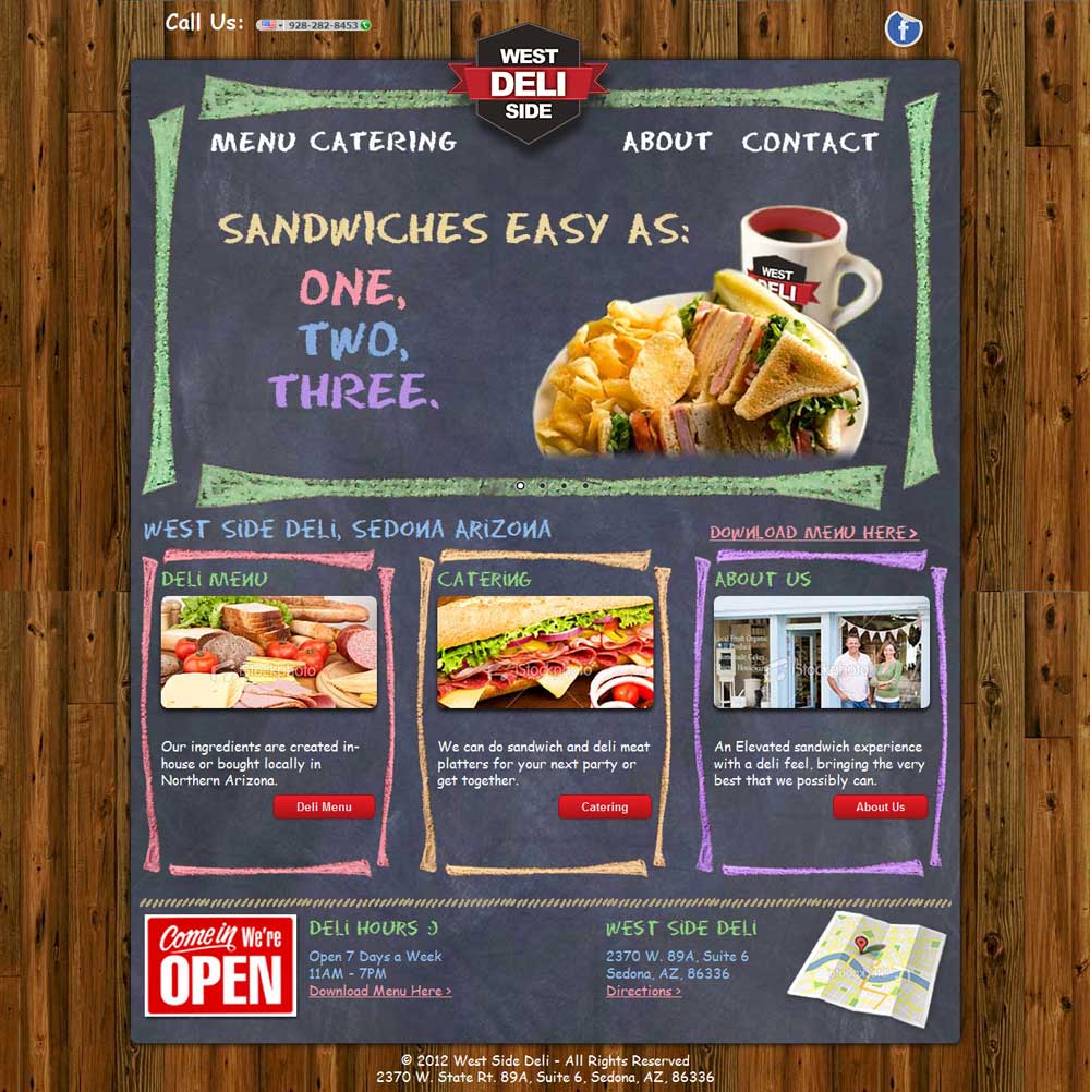 Located in Sedona Arizona. A new business and they needed a website for the public. The restaurant theme is primary chalkboard, they wanted something with a ‘fun’ feel to the main navigation, and a ‘New York Deli’ style.